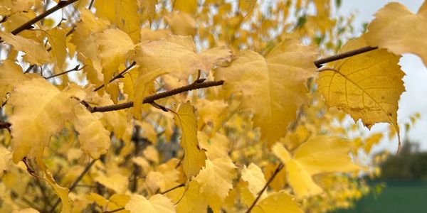 Tall, slender tree with white bark and arched branches. Its green leaves turn bright yellow in Autumn.