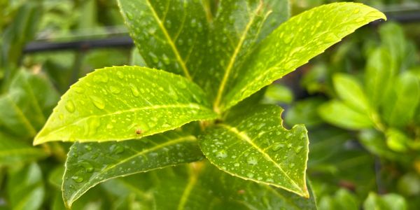 Large, spreading evergreen shrub with large, glossy, dark-green leaves and small white flowers which mature into cherry-red fruits.
